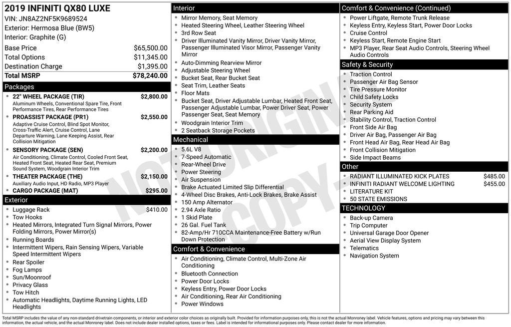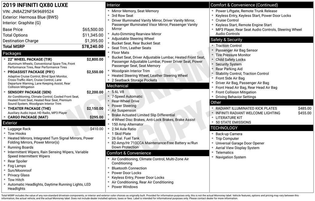 Whether you're embarking on a family adventure or seeking a luxurious daily driver, this 2019 INFINITI QX80 LUXE is the perfect choice. Experience the pinnacle of SUV refinement and capability – schedule a test drive today and discover the difference for yourself.