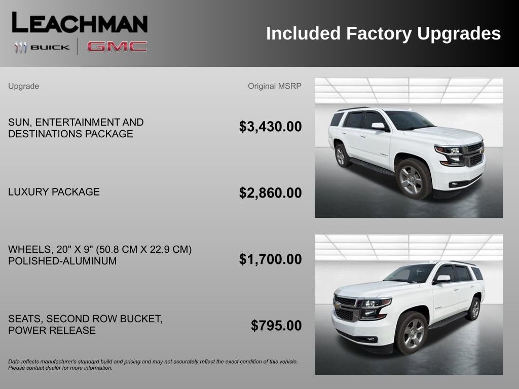 The Tahoe's impressive list of amenities doesn't stop there. Enjoy the convenience of the hands-free power liftgate, the comfort of heated leather-wrapped steering wheel, and the entertainment of the Bose premium audio system. And with the Sun, Entertainment and Destinations Package, you'll have access to SiriusXM Radio, a rear-seat DVD entertainment system, and an 8-inch touchscreen navigation system to keep you connected and entertained on the road.