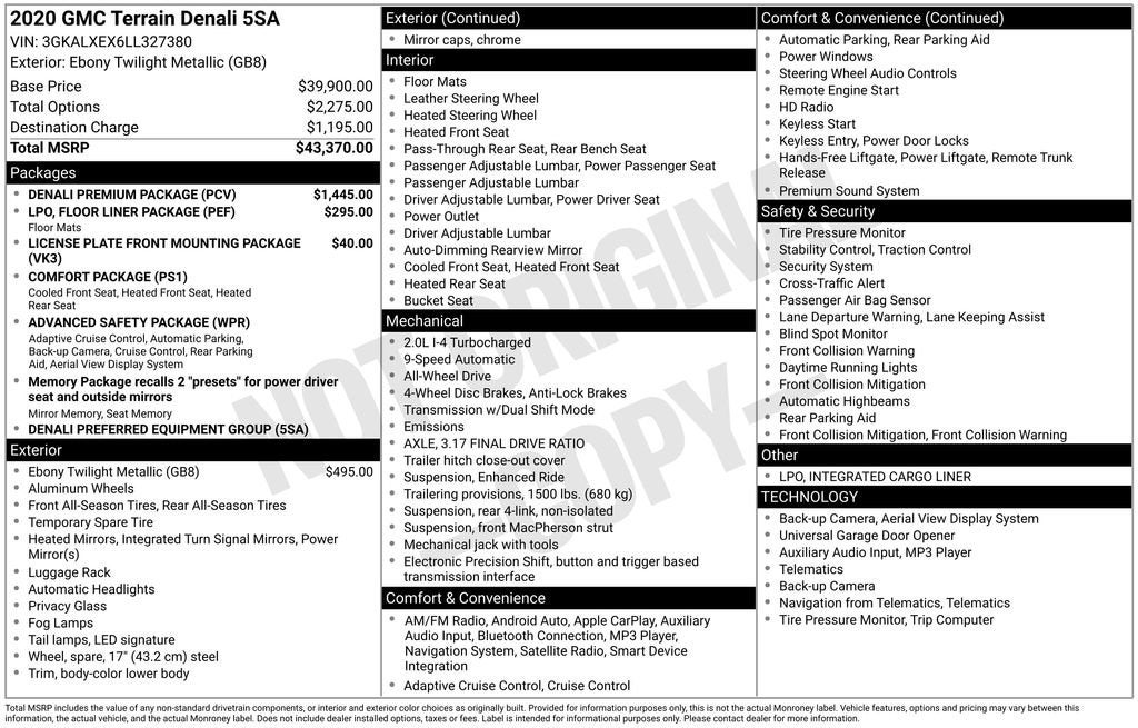 Elevate your driving experience with this exceptional 2020 GMC Terrain Denali. Boasting a sleek Black exterior, this Denali model exudes refined style and uncompromising capability.
