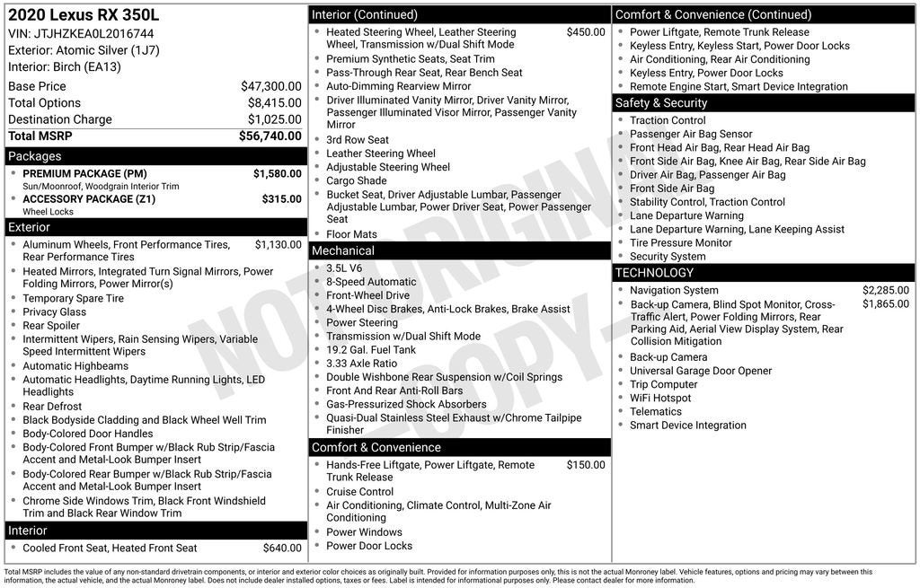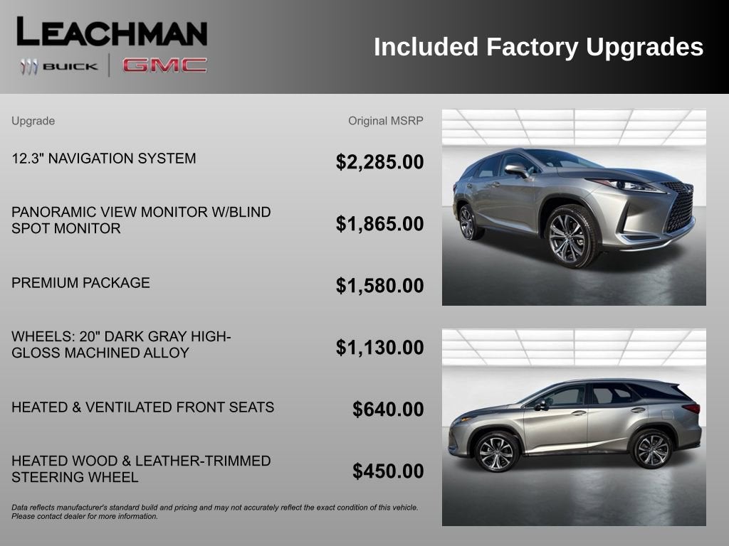 Elevate your driving experience with this remarkable 2020 Lexus RX 350L. Boasting a sleek silver exterior and a well-appointed interior, this SUV is the perfect blend of luxury, performance, and versatility.Indulge in a host of premium features, including:- Local trade with clean accident history- Premium package with power sunroof, navigation, and premium audio- Heated and ventilated front seats, heated steering wheel, and panoramic view monitor- Blind spot monitor, intuitive parking assist, and power liftgate with kick sensorThe RX 350L's 3.5L V6 engine and 8-speed automatic transmission deliver a smooth and efficient driving experience, with an impressive 19 city/26 highway MPG. Enjoy the confidence of front-wheel drive and the convenience of a spacious 3-row interior, perfect for your growing family or active lifestyle.Discover the exceptional craftsmanship and attention to detail that sets the Lexus RX 350L apart. The premium leather-wrapped steering wheel, wood interior trim, and 12.3-inch navigation system create an environment of unparalleled sophistication. The panoramic view monitor and intuitive parking assist make navigating tight spaces a breeze, while the blind spot monitor and lane change assist provide added peace of mind on the open road.Whether you're embarking on a family road trip or navigating the daily commute, this Lexus RX 350L is the perfect companion. Experience the ultimate in luxury, performance, and technology – visit our showroom today and let us help you find your next dream vehicle.We are the #1 VOLUME GMC DEALER IN KENTUCKY! Every effort is made to ensure the accuracy of the information contained in this classified listing. Dealer is not responsible for errors or omissions as much of the information is compiled from 3rd party data source feeds. PRINT & BRING US THIS PAGE to the dealership for a 100% accurate equipment list of accessories, equipment & vehicle history. Late evening and Sunday appointments are available. Proudly serving: Bowling Green, Nashville, Hopkinsville, Clarksville, Campbellsville, Elizabethtown, Lebanon, Louisville, Russell Springs, Owensboro, Horse Cave, and greater Kentucky and middle Tennessee.