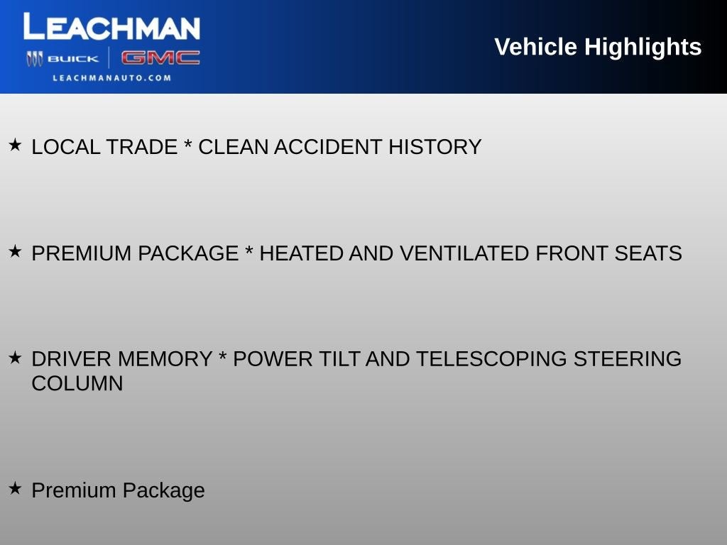 - Premium Package with Heated and Ventilated Front Seats, Driver Memory, Power Tilt and Telescoping Steering Column